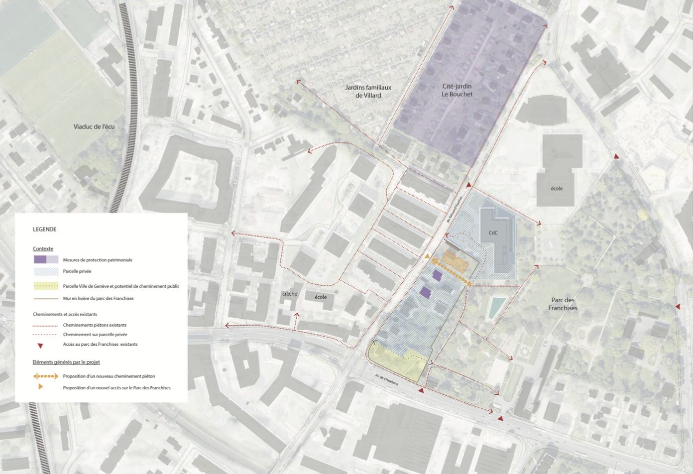 Le projet souhaite renforcer les qualités paysagères de la parcelle et propose de créer une perméabilité piétonne du lieu en ouvrant un passage clair entre le parc des Franchises et l’avenue Edmond-Vaucher. Pour ce faire, la future construction se décompose en deux volumes, lesquels créent une cassure répondant mieux au front de rue et au front du parc. La végétation présente est préservée sur tous les pourtours de la parcelle, mais certains spécimens seront déplacés, en concertation avec l’OCAN.